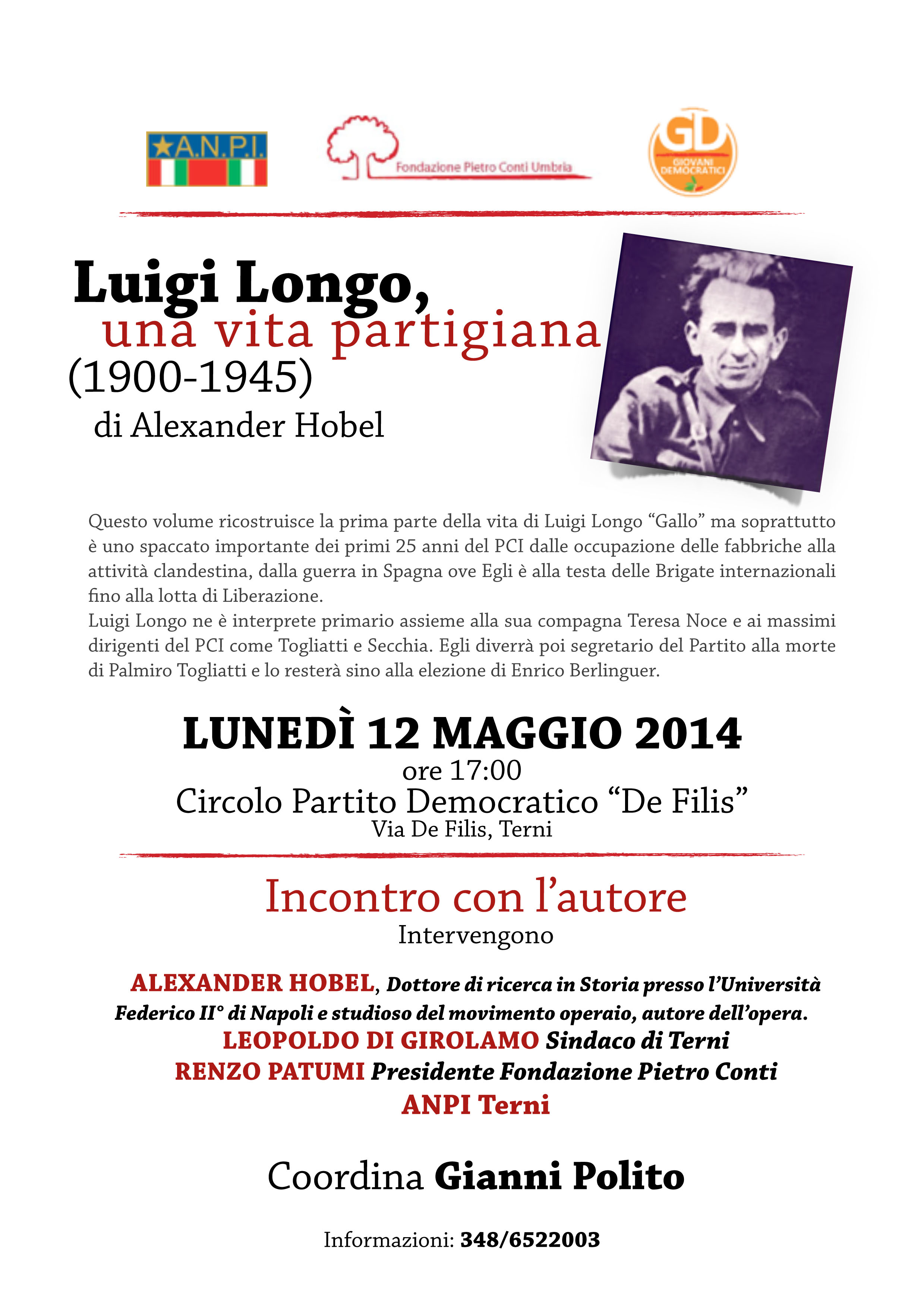 Nel corso del dibattito sarà presentato il libro “Luigi Longo, una vita partigiana (1900 – 1945)” di Alexander Höbel